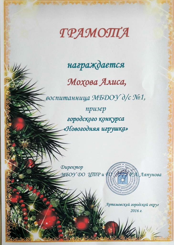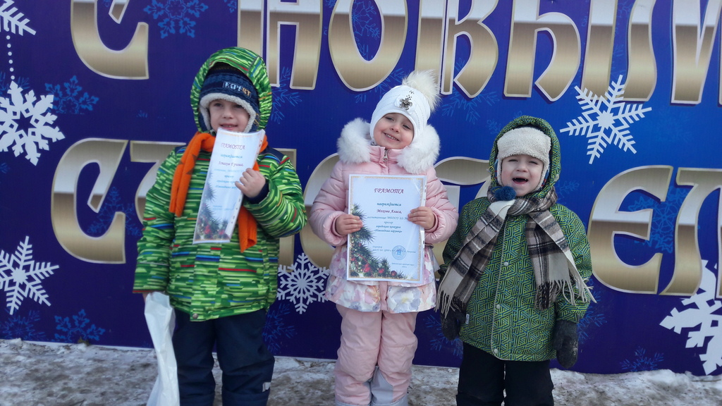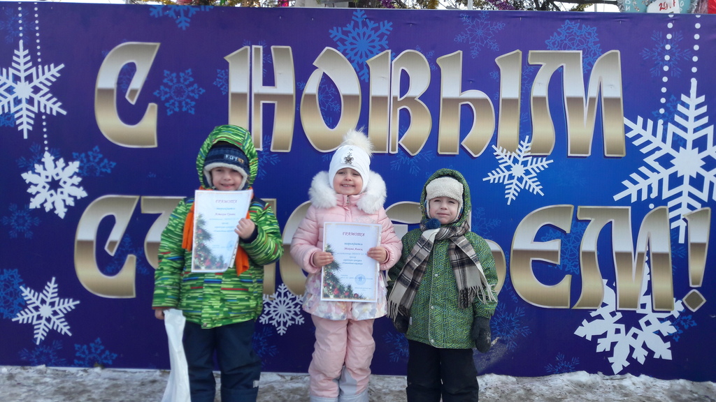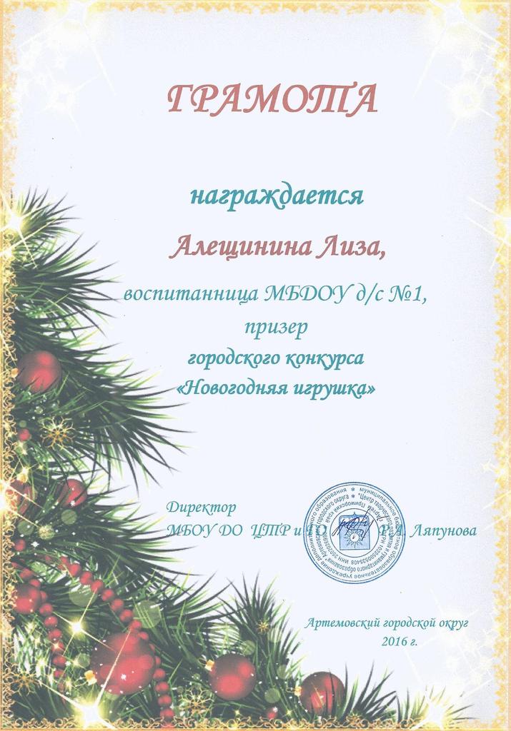 По доброй традиции ежегодно на территории Артемовского городского округа в канун Нового Года объявляется конкурс на лучшую новогоднюю игрушку. Воспитанники нашего дошкольного учреждения совместно с родителями приняли самое активное участие в данном конкурсе в декабре 2016 года. Лучшие работы удостоились «почетного места» на центральной городской елке. Среди лучших были и работы наших воспитанников: Мохова Алиса (4лет), Астахов Гриша (5 лет), Алещинина Лиза (6 лет). За свои работы дети были награждены грамотами и пригласительными билетами на новогоднее представление у городской елки.