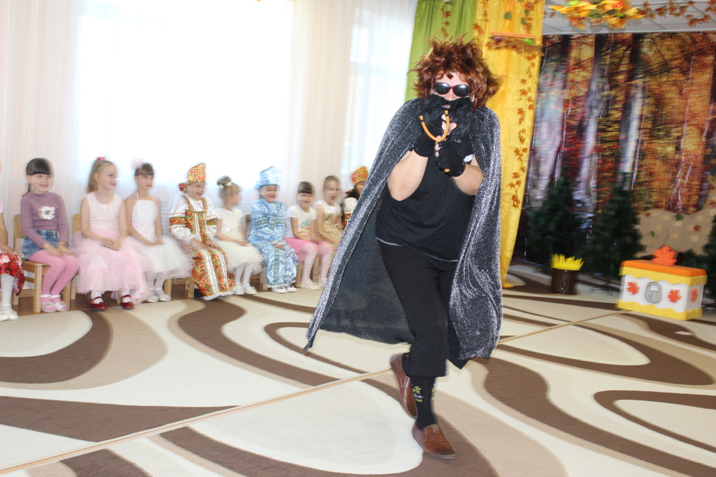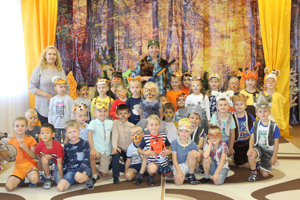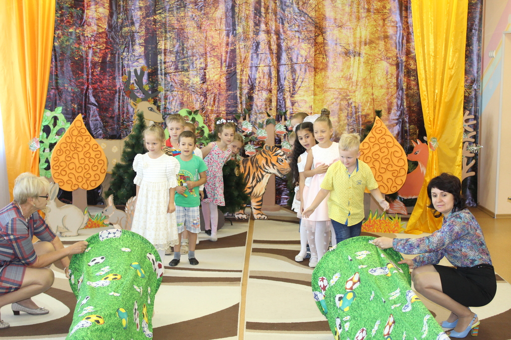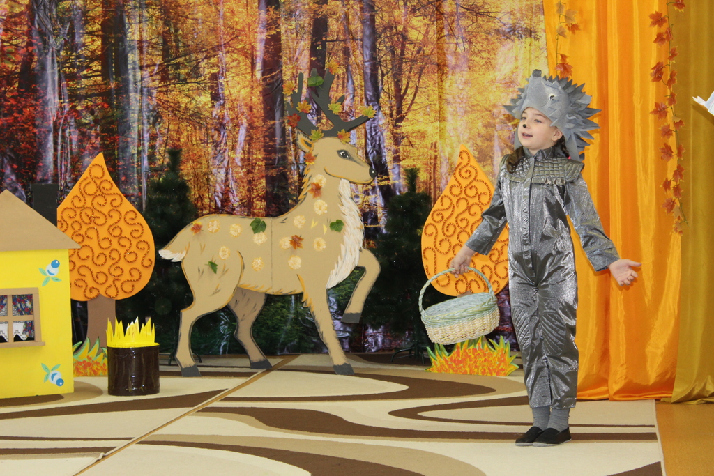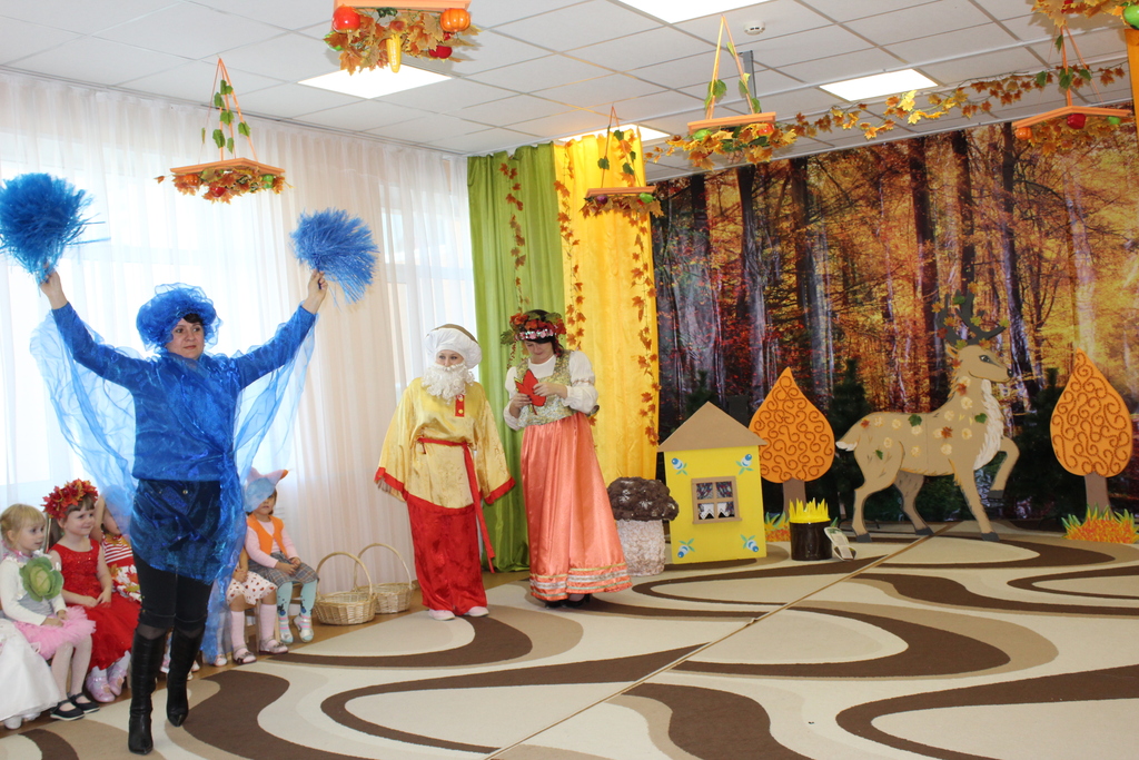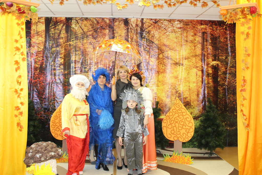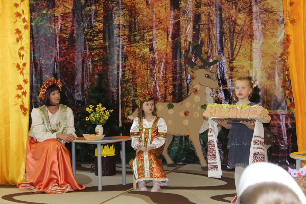 Центральная стена музыкального зала, в котором с 25 по 30 октября проходили праздники осени, в этом году была оформлена новым панно с изображением пейзажа осеннего леса. Подвесные гирлянды с осенними листьями, крона объемных деревьев в красно-желтом цвете, плоскостные фигуры животных создавали ощущение реальности осеннего леса.