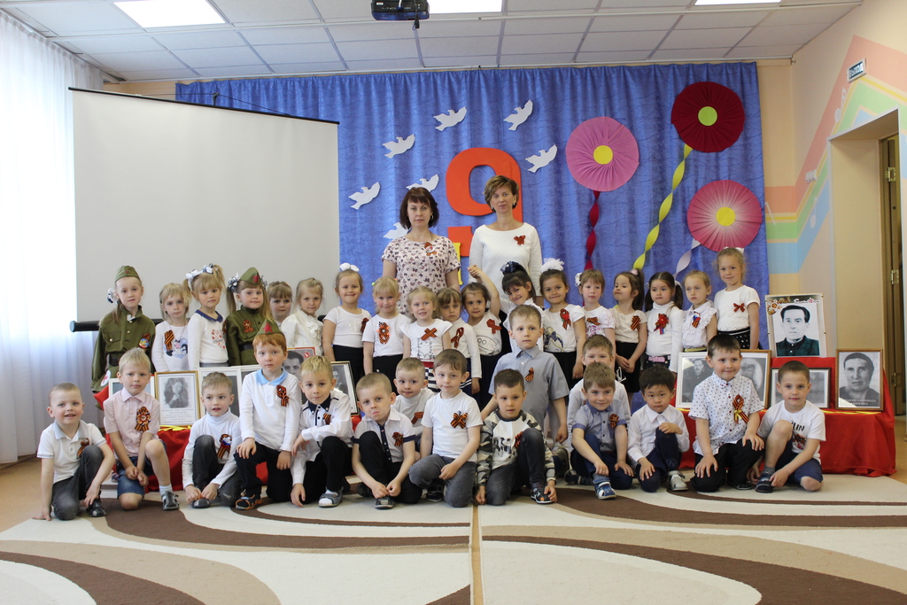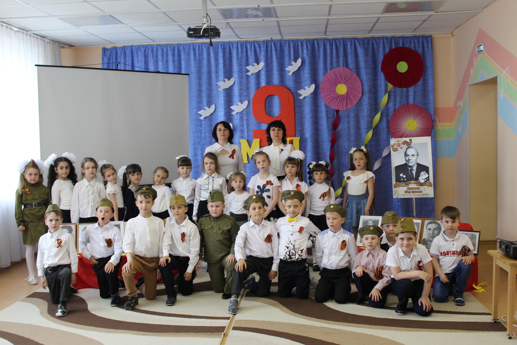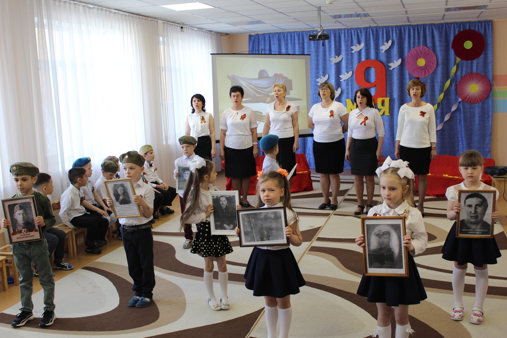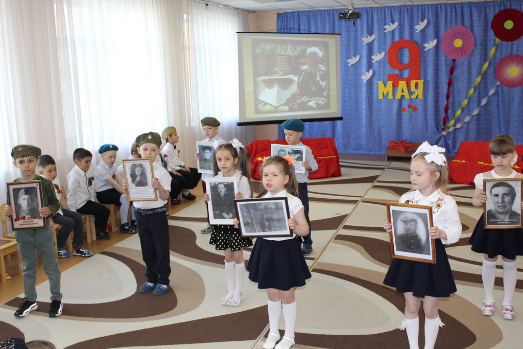 Дети подготовительных к школе групп читали стихотворения, исполняли песни, танцевали. Главным оформлением музыкального зала были портреты участников великих событий, которые принесли сами дети. Портреты своих родственников, тех, кому мы сегодня обязаны мирным небом, держали ребята с особенной гордостью; получился такой небольшой, но очень значимый «Бессмертный полк». Мальчики и девочки в белых рубашках с георгиевскими ленточками на груди в торжественный момент - минуту молчания склонили головы и тихо стояли в знак памяти о подвиге нашего народа.