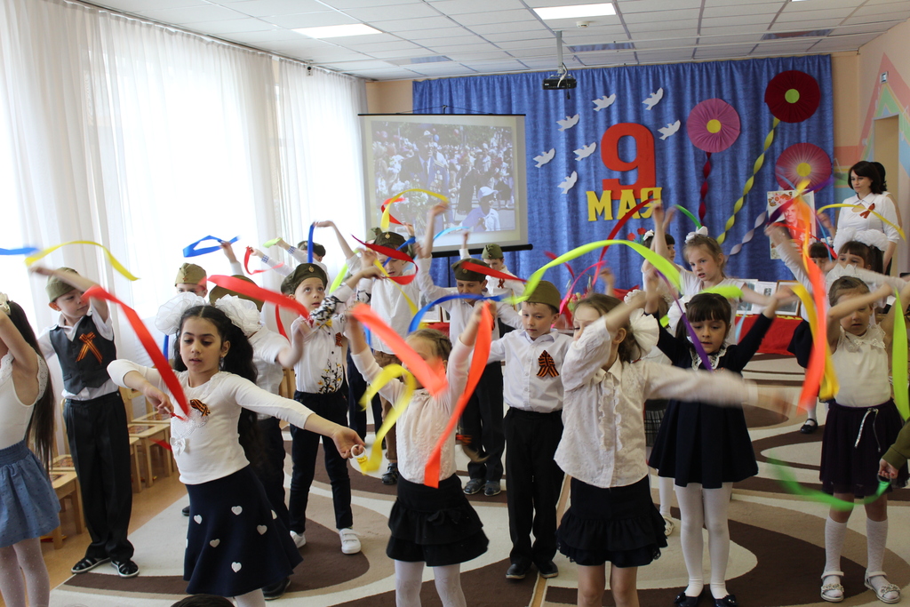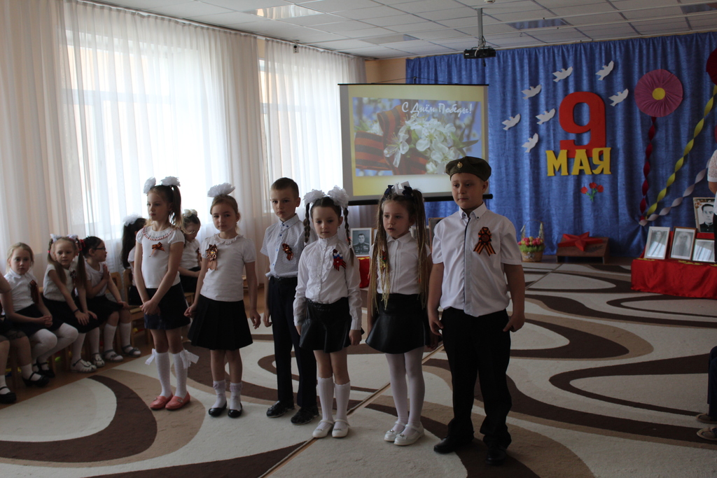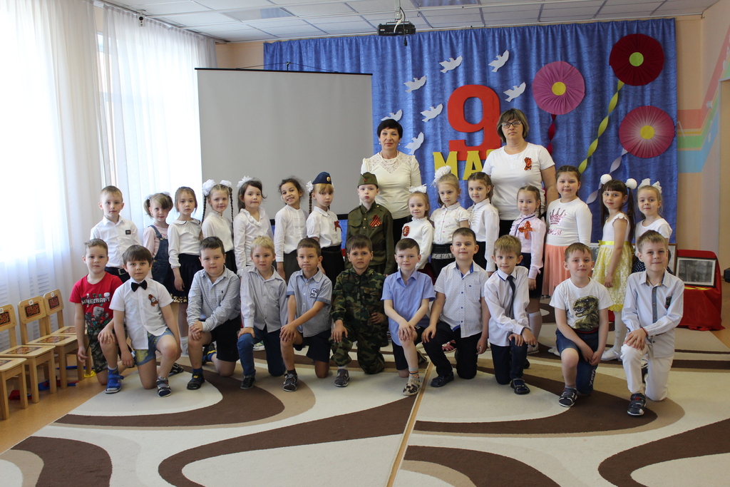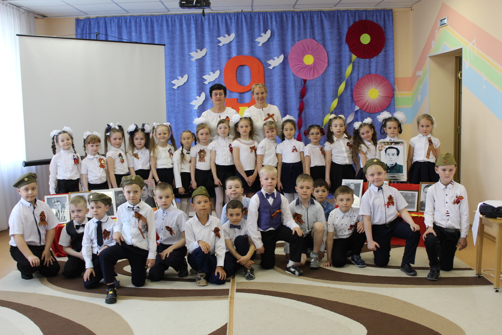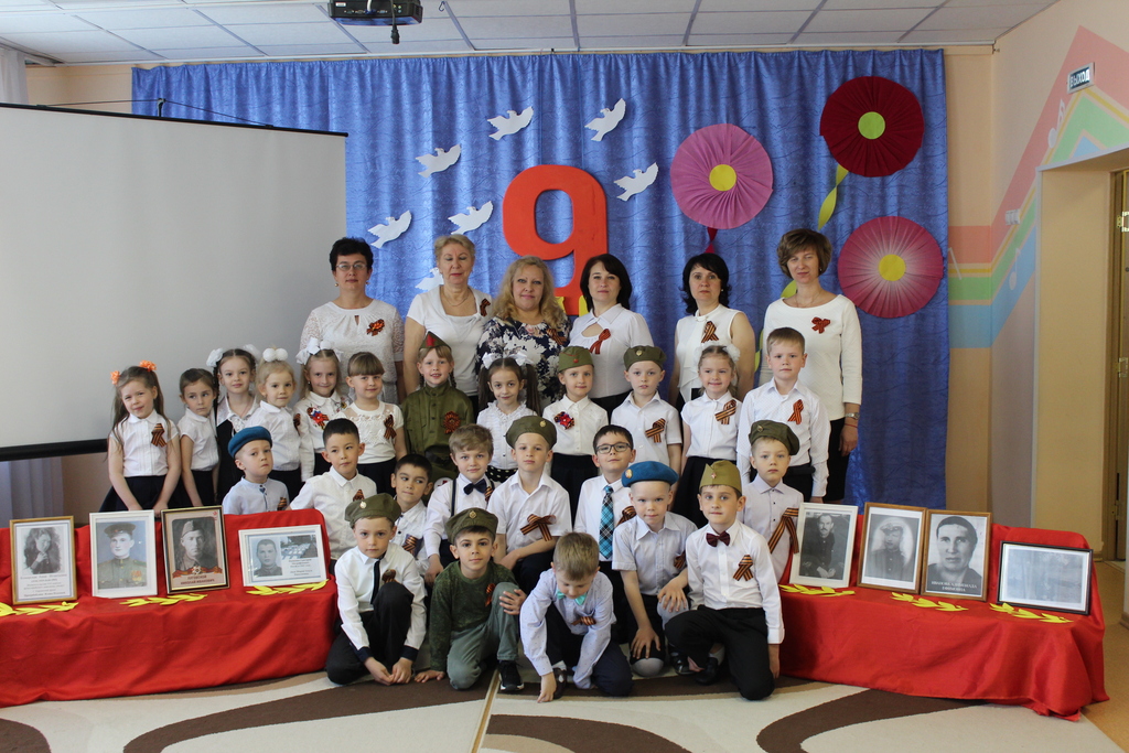 Дети подготовительных к школе групп читали стихотворения, исполняли песни, танцевали. Главным оформлением музыкального зала были портреты участников великих событий, которые принесли сами дети. Портреты своих родственников, тех, кому мы сегодня обязаны мирным небом, держали ребята с особенной гордостью; получился такой небольшой, но очень значимый «Бессмертный полк». Мальчики и девочки в белых рубашках с георгиевскими ленточками на груди в торжественный момент - минуту молчания склонили головы и тихо стояли в знак памяти о подвиге нашего народа.