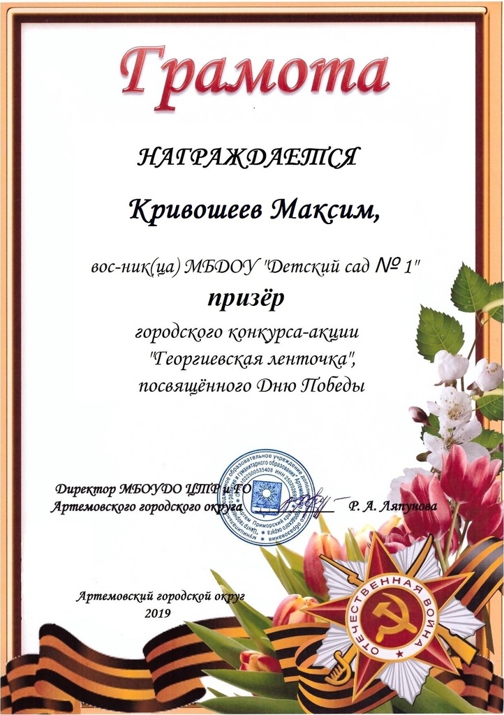 Так, грамотой Победителя городского конкурса-акции «Георгиевская ленточка», посвященного Дню Победы, награждена воспитанница детского сада Санина София, грамоты призеров данного конкурса получили наши воспитанники Белова Полина и Кривошеев Максим.