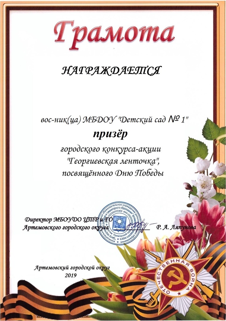В целях формирования гражданско-патриотического сознания у детей и подростков, уважительного отношения и сохранения памяти о героизме советского народа в годы Великой Отечественной войны, создания общественного символа Дня Победы в апреле 2019 года в городе Артеме был организован конкурс – акция по изготовлению символа Победы (георгиевская ленточка). К участию в конкурсе приглашались и воспитанники дошкольных образовательных учреждений в возрасте от 5 до 7 лет.