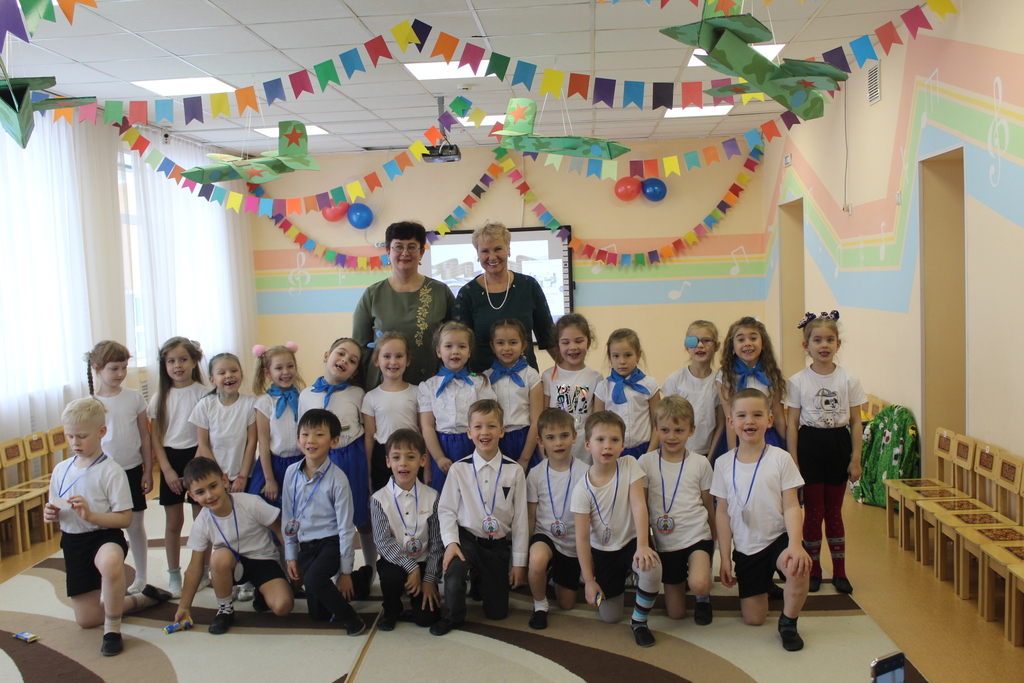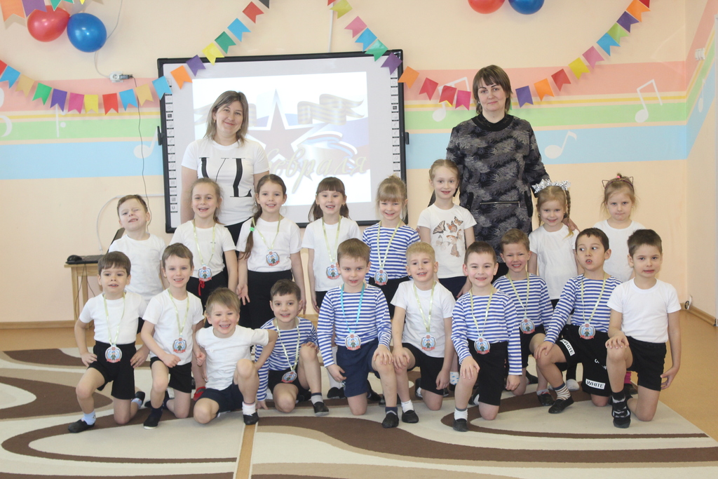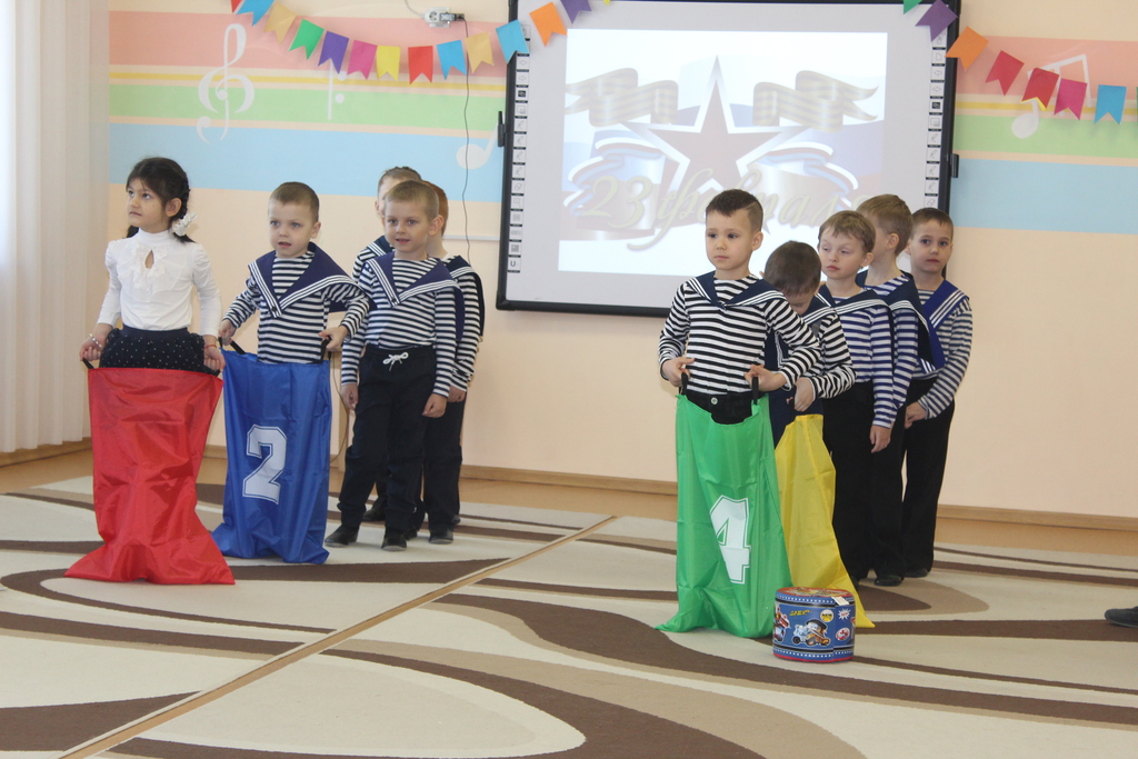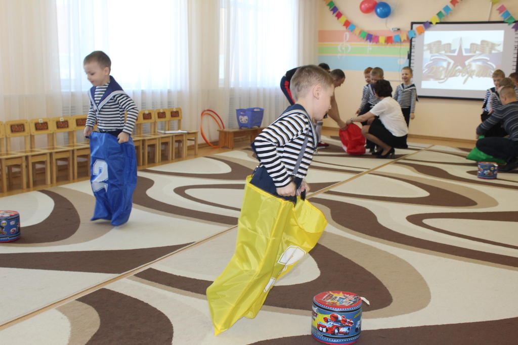 Под веселый боевой марш входили воспитанники старшего дошкольного возраста в празднично украшенный зал, в котором проходили спортивные соревнования. Педагоги вместе с ребятами заранее придумали названия команд, форму, девиз, разучили стихи и песни о Родине и нашей славной армии.