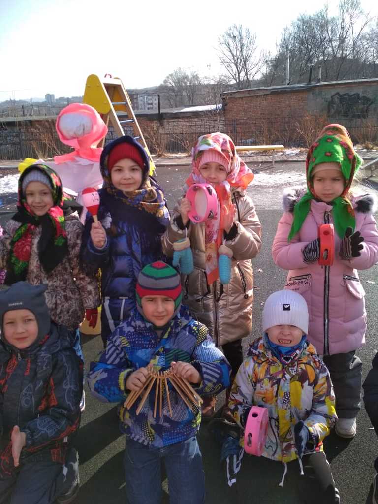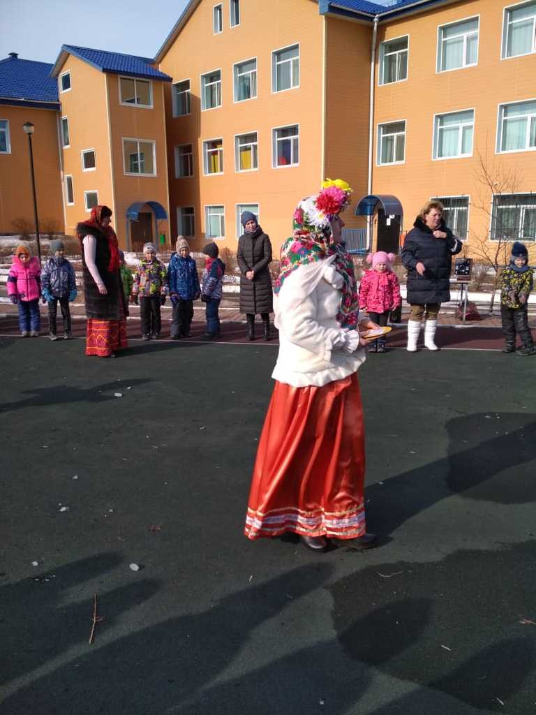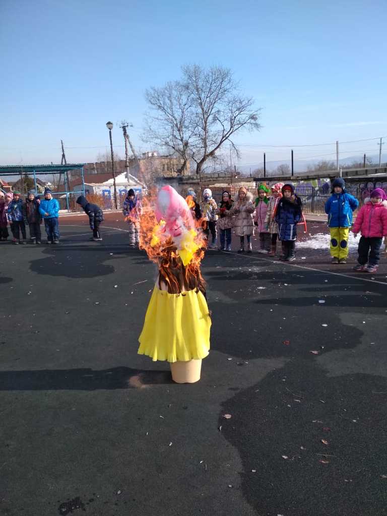Под веселую русскую народную мелодию выходили дети на прогулку в этот день. Добавляло задора и игра детей на музыкальных инструментах: деревянные ложки, свистульки, трещетки. Ведущими на этом веселом празднике были Марьюшка, Зима и Весна. Активными участниками праздничных гуляний были воспитанники старших и подготовительных к школе групп, дети младших и средних групп были зрителями. Для ребят были организованы различные подвижные и хороводные игры: «Горелки», «Елочки-пенечки», «Снег руками нагребаем..», «Весна-красна приходи». Особое веселье вызвал у всех участников мероприятия момент, когда под речетатив «На Масленницу мы чучело сжигаем, Зиму прогоняем» состоялось сжигание чучела. Наряду с играми, песнями и прибаутками, педагоги не забывали рассказывать детям о том, какие традиции празднования Масленницы пришли к нам с древних времен и сохранились до сих пор. Так, по древнему обычаю, без которого не могли состояться проводы зимушки-зимы, надо попросить друг у друга прощения за все обиды, которые иногда случаются в жизни, обняться и помириться. Все участники гулянья так и сделали: попросили прощения, обнялись и с хорошим эмоциональным настроением проводили матушку-зиму.