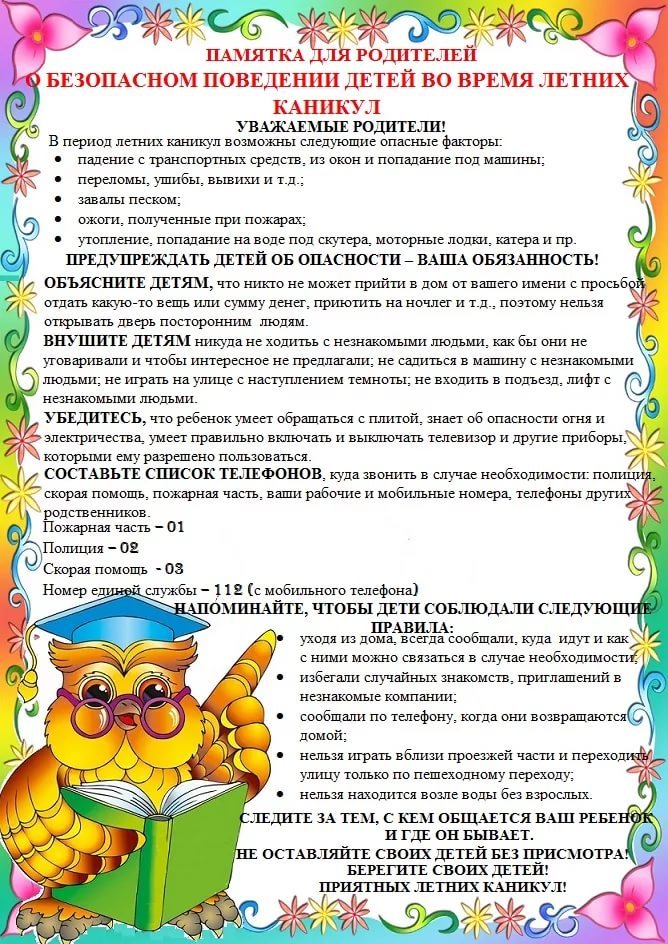 Летом, с началом каникул, наших детей подстерегает повышенная опасность на дорогах, у водоемов, в лесу, на игровых площадках, в саду, во дворах. Этому способствует погода, летние поездки и любопытство детей, наличие свободного времени, а главное отсутствие должного контроля со стороны взрослых. Чтобы дети были отдохнувшими, здоровыми и живыми надо помнить ряд правил и условий при организации их отдыха с родителями, родственниками, друзьями (на даче или в деревне у бабушки):
