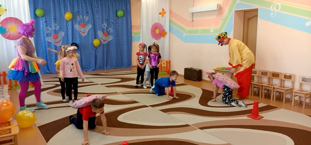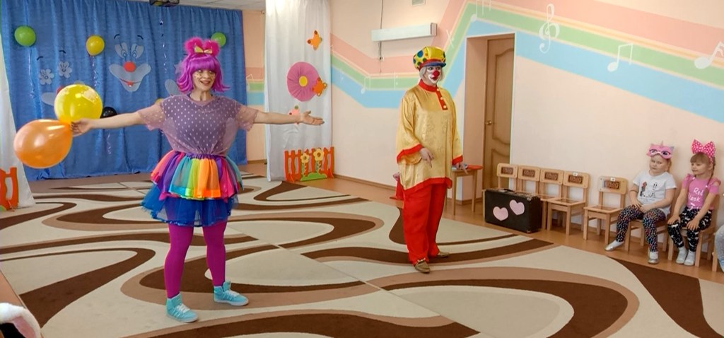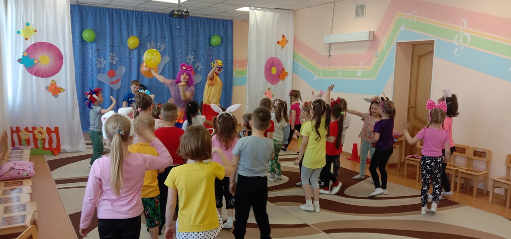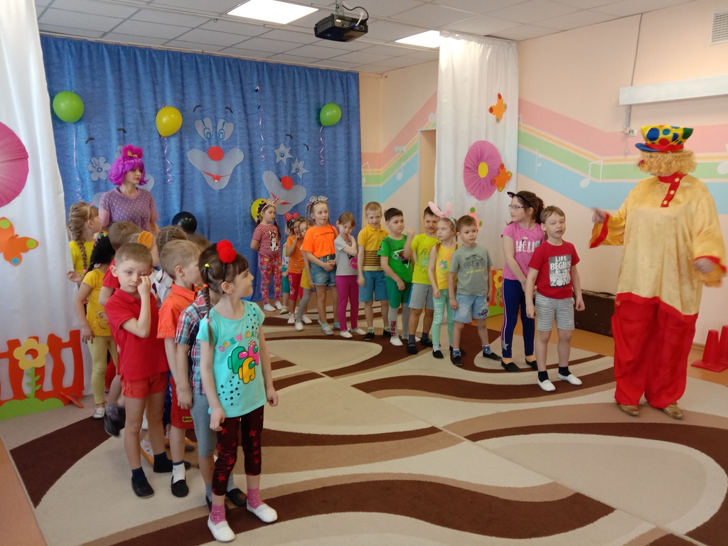 Воспитатели заранее оформили музыкальный зал, роли клоунов «Кнопы» и «Бима» исполняли Ермолина Марина Сергеевна и Щетинюк Вайра Евгеньевна.