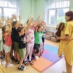 В программе праздника были веселые игры: дети играли с воздушными шариками, знакомясь друг с другом, замешивали тесто для торта Чебурашки, а в конце поднимали руки, зажигая свечи на торте!