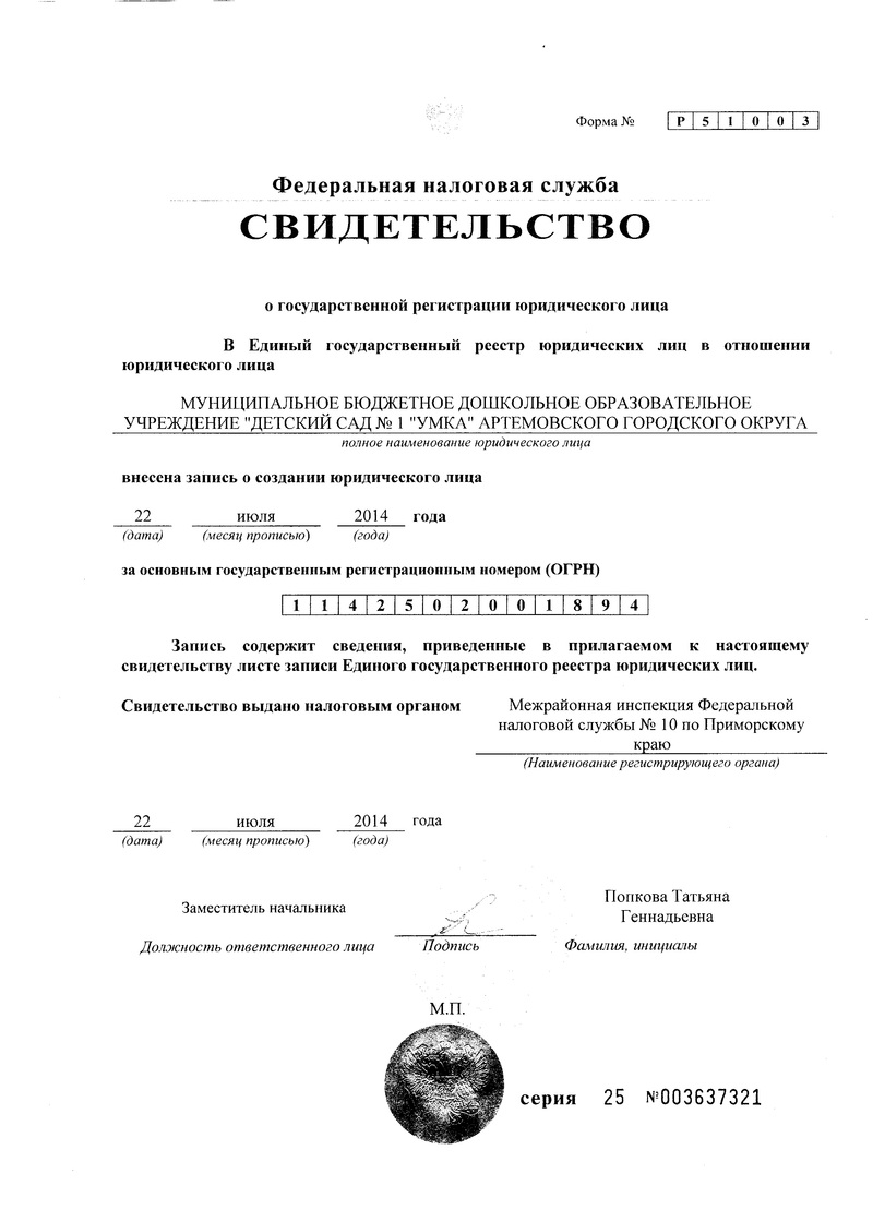 Главная Сведения об образовательной организации Документы Свидетельство о государственной регистрации юридического лица