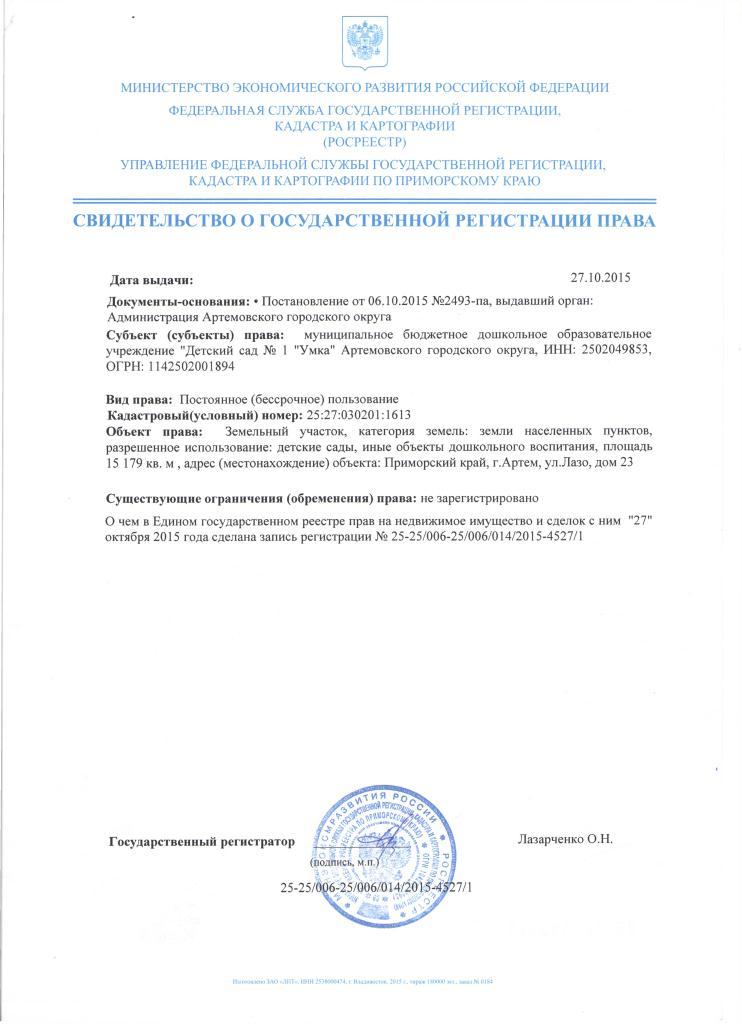 Главная Сведения об образовательной организации Документы Свидетельство о государственной регистрации права на земельный участок