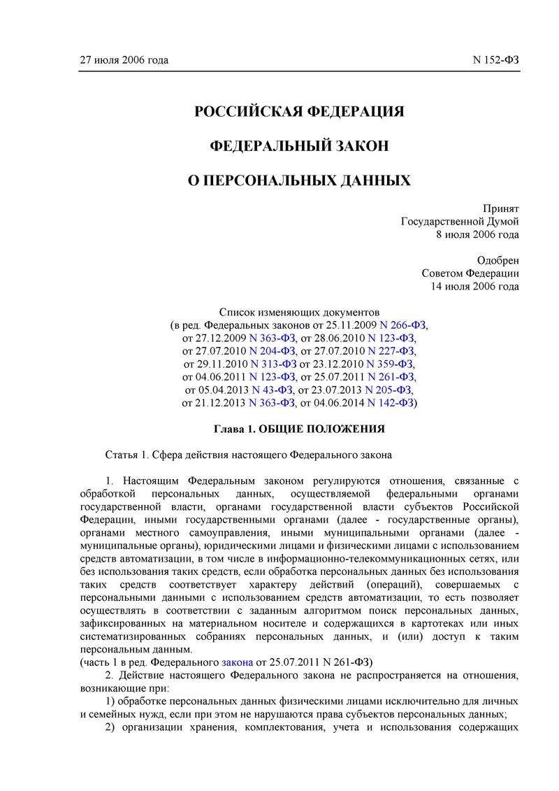 Главная Информационная безопасность Нормативно-правовая база Федеральный закон РФ от 27.07.2006 г. № 152 - ФЗ "О персональных данных"
